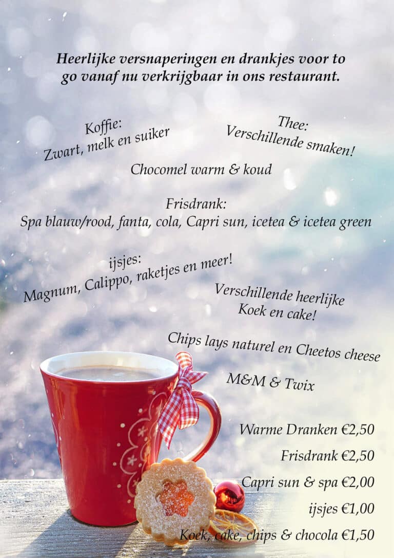 Heerlijke versnaperingen en drankjes voor to go vanaf nu verkrijgbaar in ons restaurant.